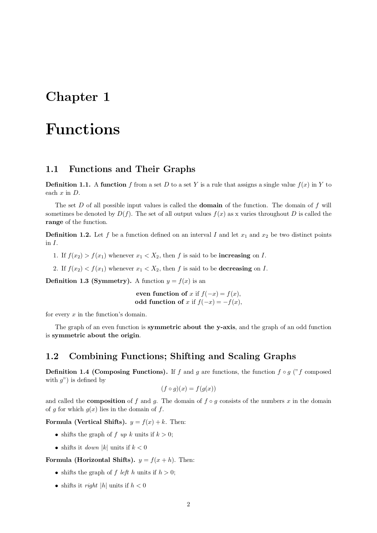 Chapter 1에서는 기초적인 함수의 특성을 다룬다. Even function과 odd function, transformation rules for fuction, trigonometric identities 등의 내용이 포함된다.