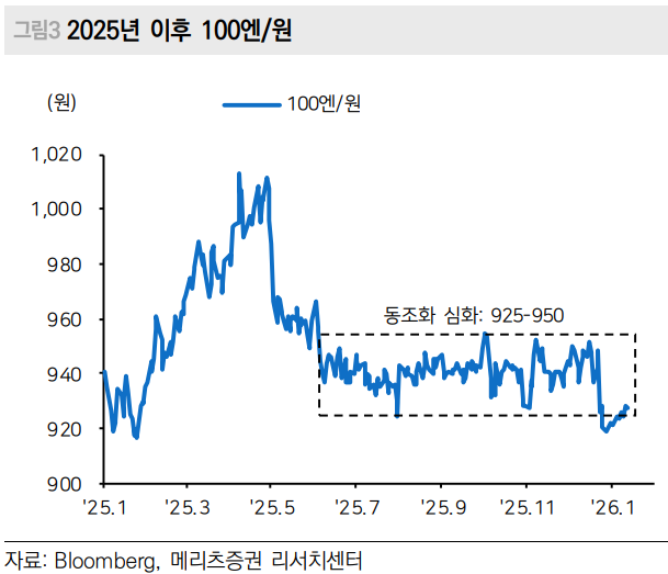 원화 약세의 가장 유의미한 대외 요인은 엔화와의 동조화다. 작년 하반기 이후 달러/엔 환율은 상승하기 시작했다. 다카이치 사나에의 자민당 총재 선출 이후부터 통화 완화를 핵심으로 하는 아베노믹스의 부활이 예상됐기 때문이다. 최근에는 다카이치의 높은 지지율에 힘입어 조기 총선까지 거론되며 엔화 약세 기대가 더욱 강화되고 있다.