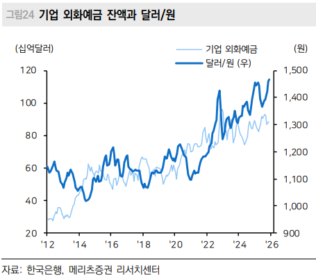 기업의 부담도 무시하기 어렵다. 수출 기업은 환전 시점을 관망하고 있으며, 그 결과 외화예금을 쌓아두는 방식으로 대응하고 있다. 이러한 행태는 단기적으로 외환 공급을 제약하며 환율의 높은 수준을 유지시키는 요인으로 작용한다.