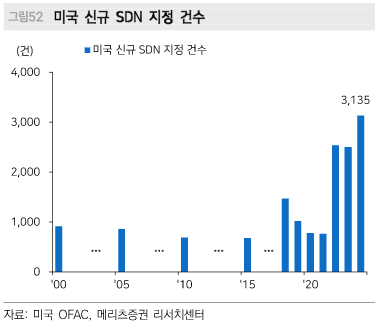 아래 그래프는 미국 재무부 산하 해외자산통제국(OFAC)이 외국 금융기관에 가하는 가장 높은 수준인 제재인 SDN(Specially Designated Nationals) 신규 지정 건수인데 2024년 역대 최고 수준을 기록했다. 러시아-우크라이나 전쟁 영향도 있으나 근본적으로는 자국우선주의 기조하에서 늘어난 것으로도 해석할 수 있다.