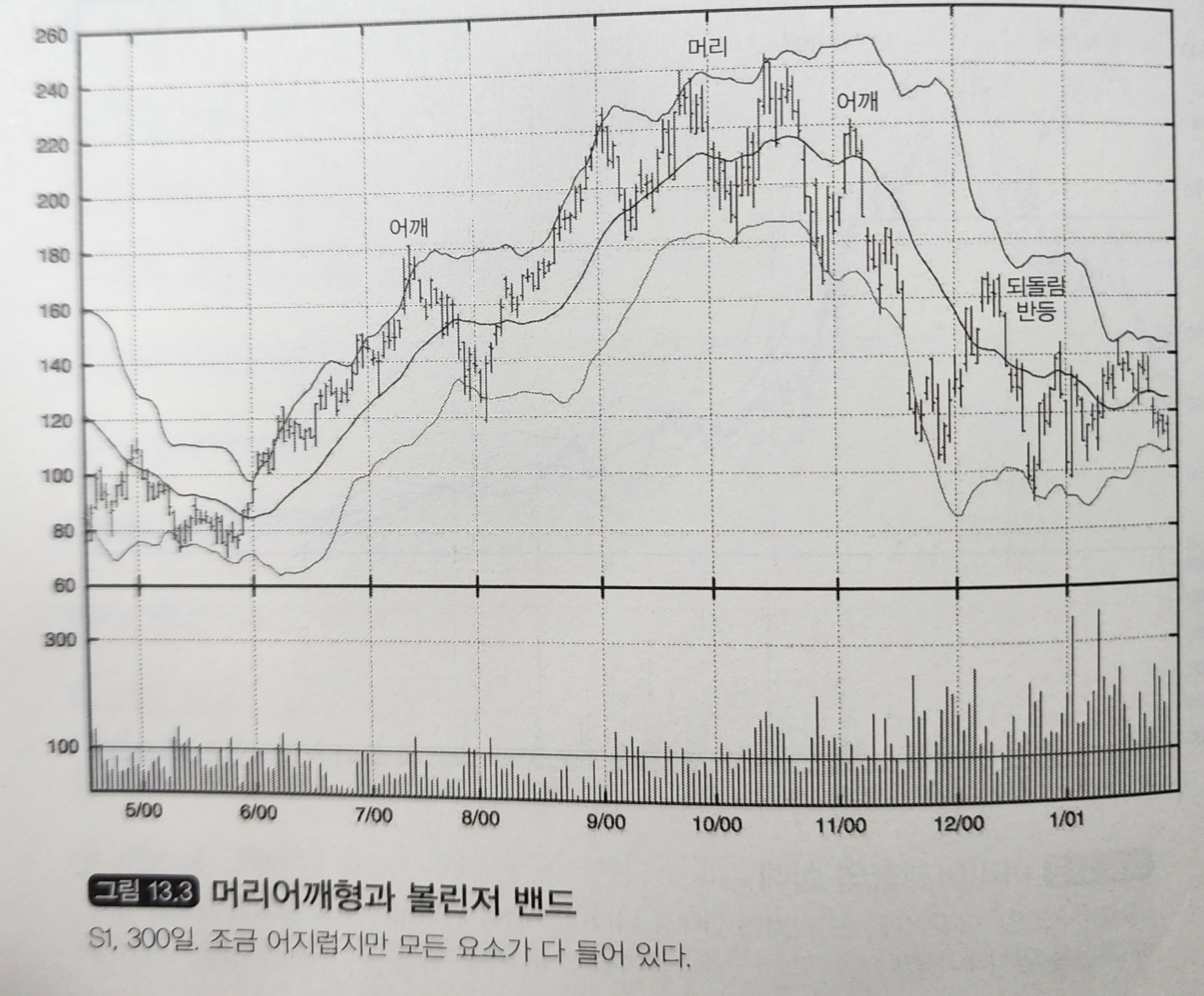 전형적인 패턴은 왼쪽 어깨가 볼린저 밴드 상단 바깥에 있고 머리는 상단 밴드를 태그하며 오른쪽 어깨가 상단 밴드에 훨씬 못 미치는 형태다.