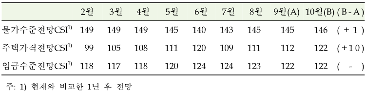 눈에 띄는 부분은 주택 가격 전망이 10p 상승했다는 점이다. 조사 기간이 10월 14일부터 17일까지라 15일 부동산 대책 영향을 부분적으로만 반영됐다는 점을 고려해도 상승폭은 컸다. 이는 6월부터 이어진 정부의 부동산 안정 대책이 기대만큼의 효과를 내지 못하고 있음을 보여준다.