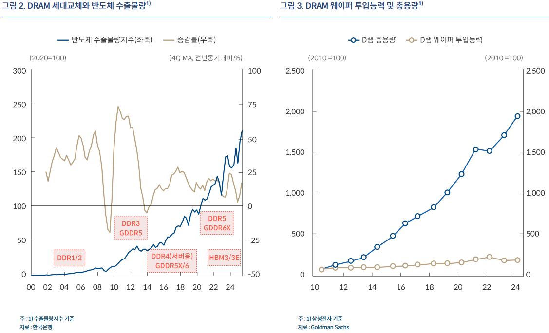 웨이퍼 투입능력은 2010~2024년중 연평균 5.4% 증가한 반면 DRAM 총용량은 같은 기간 연평균 23.6% 증가했다. 반도체 수출물량은 제품 혁신이 이어져 오면서 장기적으로 증가 추세를 보인다.