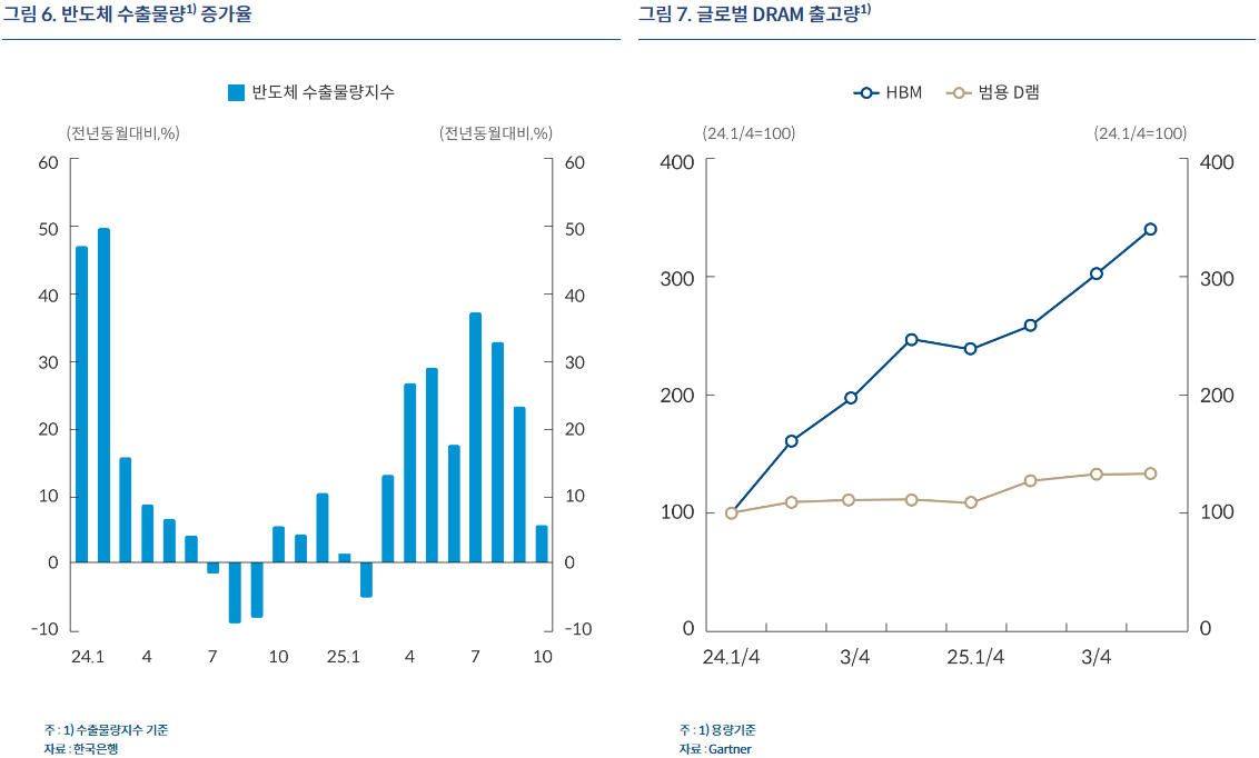 반도체 수출물량은 올해 1분기 주춤했지만 2분기부터 전년동월대비 뚜렷한 증가세를 이어가고 있다. AI 데이터센터 신규 투자가 빠르게 늘어난 데다, 기존 서버의 메모리 교체 주기도 도래하면서 반도체 수요가 전반적으로 확대되었다. 여기에 DDR4 단종이 예정된 상황에서 미리 물량을 확보하려는 선수요까지 가세했다. 특히 기존 DRAM보다 패키지 용량과 전송대역폭이 크게 향상된 HBM(High Bandwidth Memory) 수출이 빠르게 증가하는 등 고성능 반도체 비중의 확대도 수출물량 증대에 기여했다.